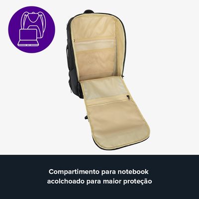 Dentre os compartimentos da mochila estão inclusos compartimento acolchoado para notebooks.